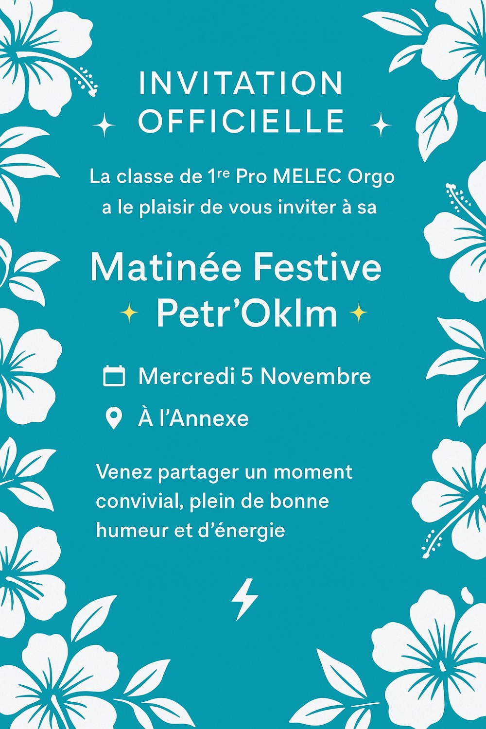 Organisée par les élèves de la 1ere MELEC - ORGO et le concours de Mme Marcias, cette matinée aura lieu mercredi 5 novembre prochain, les cours sont donc suspendus à cette date.