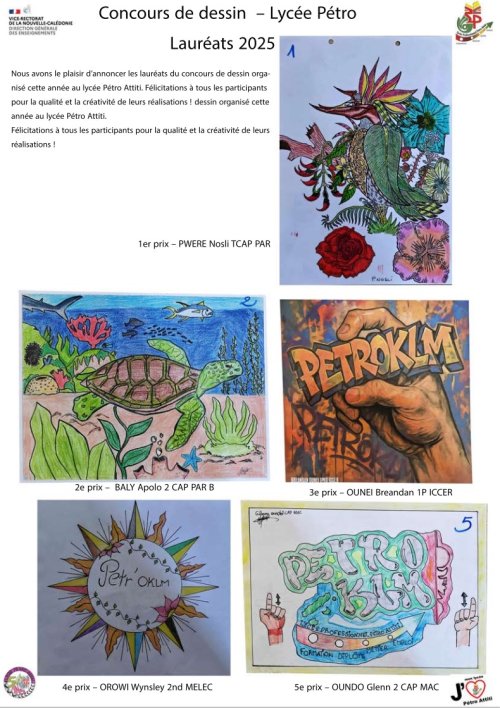A l’issue de la matinée festive Pétr’Oklm du 5 novembre dernier au cours de laquelle ont été exposées les œuvres des élèves participants au concours de dessins, le jury a classé les 5 lauréats suivants :